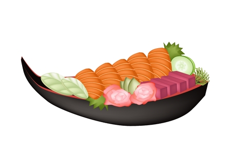 日本料理 新鮮なサーモン刺身または酒造りとマグロの刺身寿司ボート上のイラスト のイラスト素材 ベクタ Image